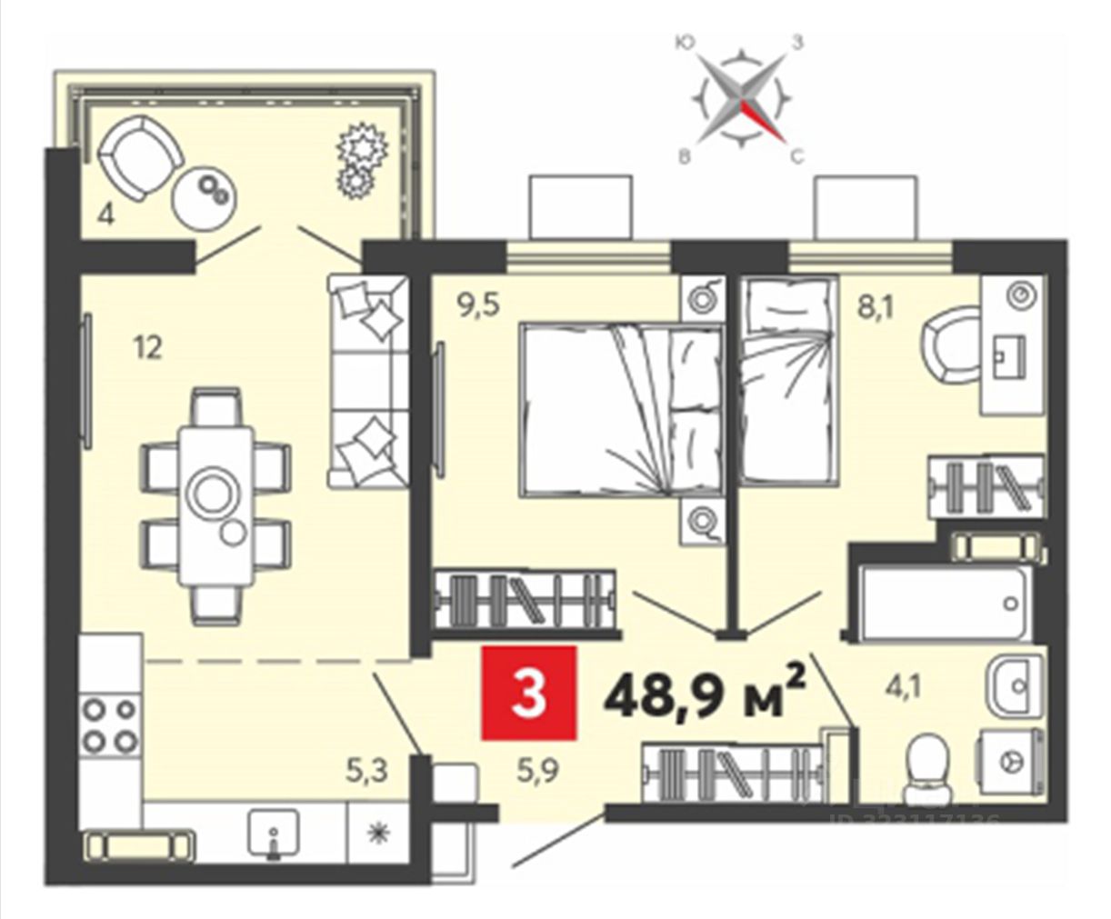 Общая площадь с учетом балкона: 48,9 кв.м.;