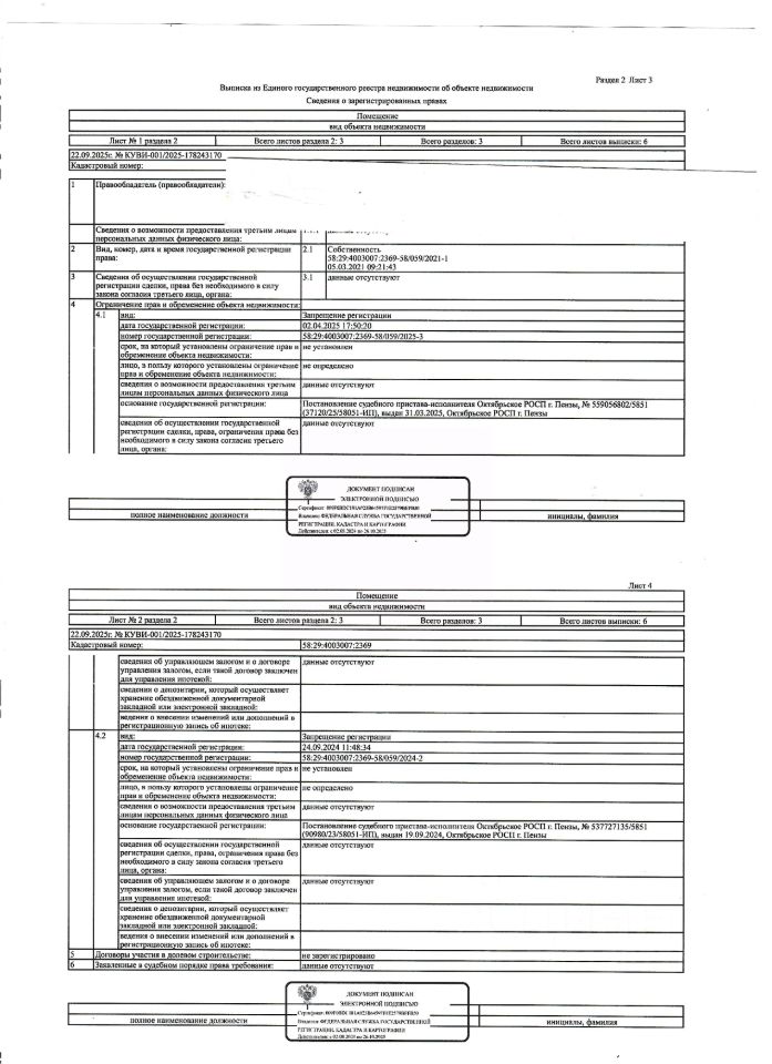 Жилое помещение (квартира) общей площадью 29 кв.м., кад. 58:29:4003007:2369, этаж 5, расположенное в пределах объекта недвижимости с кад. 58:29:4003007:479, принадлежащее должнику Глухову Д.М. По месту нахождения объекта зарегистрированные лица отсутствуют. Сведениями о задолженности по коммунальным платежам и взносам на капитальный ремонт, а также о фактическом состоянии объекта недвижимости организатор торгов не располагает. Техническая документация и фотографии объекта отсутствуют у организатора торгов.