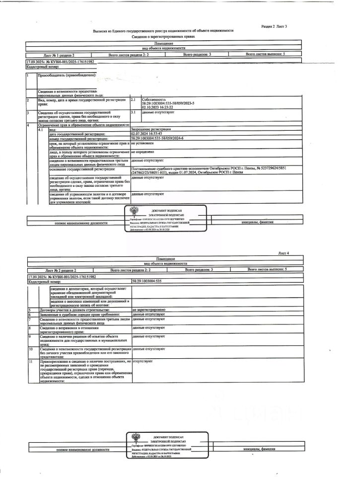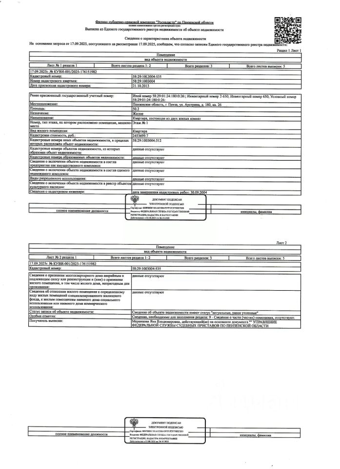 Жилое помещение (квартира) общей площадью 50,2 кв.м., кад. 58:29:1003004:535, этаж 1, расположенное в пределах объекта недвижимости с кад. 58:29:1003004:512, принадлежащее должнику Смирнову Д.ИВ. По месту нахождения объекта зарегистрированные лица отсутствуют. Сведениями о задолженности по коммунальным платежам и взносам на капитальный ремонт, а также о фактическом состоянии объекта недвижимости организатор торгов не располагает. Техническая документация и фотографии объекта отсутствуют у организатора торгов.