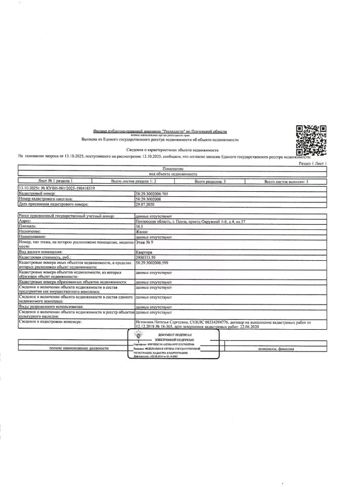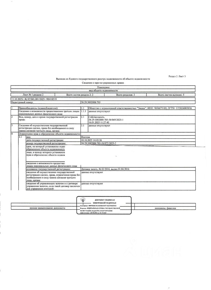 Жилое помещение (квартира) общей площадью 38,5 кв.м., кад. 58:29:3002008:705, находящееся в пределах объекта недвижимости с кад. 58:29:3002008:599, принадлежащее должнику ООО "Эколог", ИНН 5836673103. Зарегистрированные по месту нахождения объекта недвижимости лица отсутствуют. Сведениями о размере задолженности по коммунальным услугам и взносам на капитальный ремонт, а также о фактическом состоянии объекта недвижимости, организатор торгов не располагает. Ключи, техническая документация и фотографии объекта отсутствуют у организатора торгов.