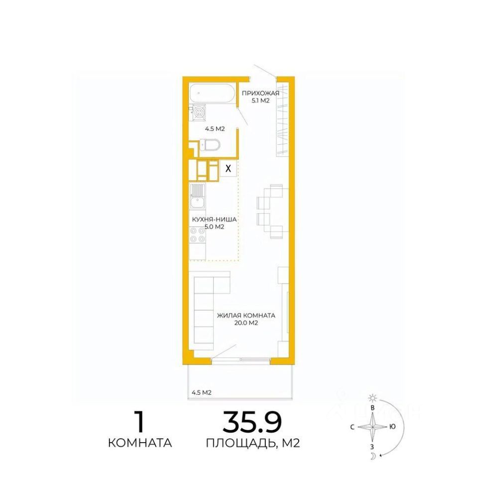 Продаётся 1-комнатная квартира в сданном доме (дом 14), срок сдачи: IV-кв. 2024, общей площадью 35.9 кв.м., на 12 этаже. Дизайнерская отделка.