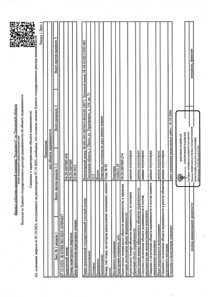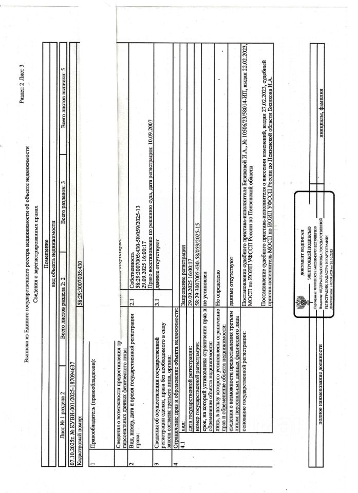 Жилое помещение (квартира 2-х комнатная) общей площадью 52,5 кв.м., кад.  58:29:3007005:430, находящееся в пределах объекта недвижимости с кад.  58:29:3007005:274, принадлежащее должнику Паксяевой С.А. Сведениями о зарегистрированных лицах, о размере задолженности по коммунальным услугам и взносам на капитальный ремонт, а также о фактическом состоянии объекта недвижимости, организатор торгов не располагает. Ключи, техническая документация и фотографии объекта отсутствуют у организатора торгов.