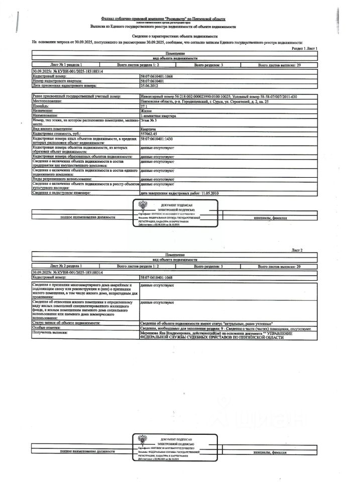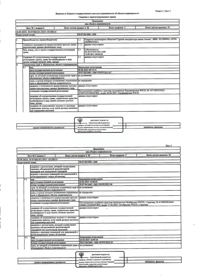 Жилое помещение (квартира) общей площадью 27,1 кв.м., кад.  58:07:0610401:1068, находящееся в пределах объекта недвижимости с кад.  58:07:0610401:1430, принадлежащее должнику ОАО  "Сурская мануфактура имени Асеева", ИНН 5812000902. По месту нахождения объекта зарегистрирован один гражданин. Сведениями о размере задолженности по коммунальным услугам и взносам на капитальный ремонт, а также о фактическом состоянии объекта недвижимости, организатор торгов не располагает. Ключи, техническая документация и фотографии объекта отсутствуют у организатора торгов.