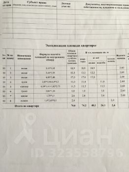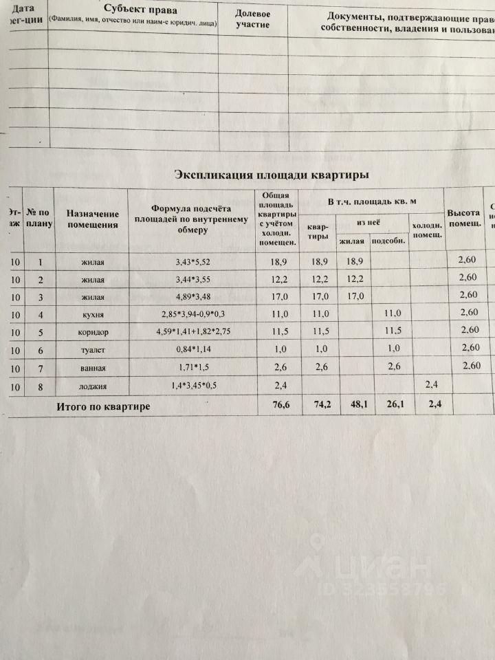 Общая площадь квартиры составляет 76,6 кв.м. (с учетом лоджии, лоджия - 2,4 кв.м). Жилая площадь - 48,1 кв.м (комнаты - 18,9 кв.м; 17,0 кв.м; 12,2 кв.м).