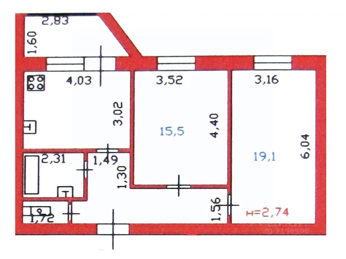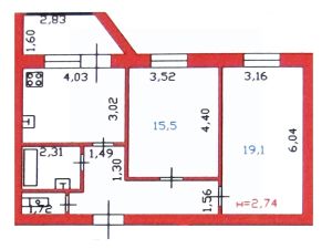 Комнаты: 15,5 + 19,1 кв.м