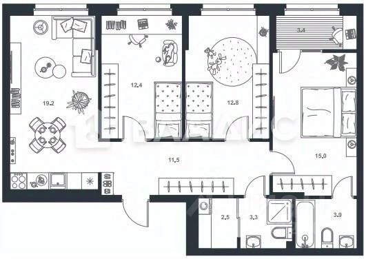 Квартира имеет современную планировку с большой кухней-гостинной 19,2 кв.м.