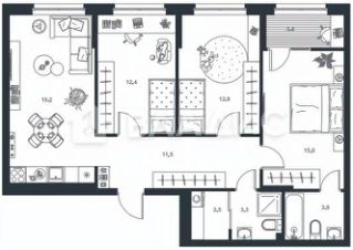 Жилая площадь: 12,4+12,8+15 = 40,2 кв.м.