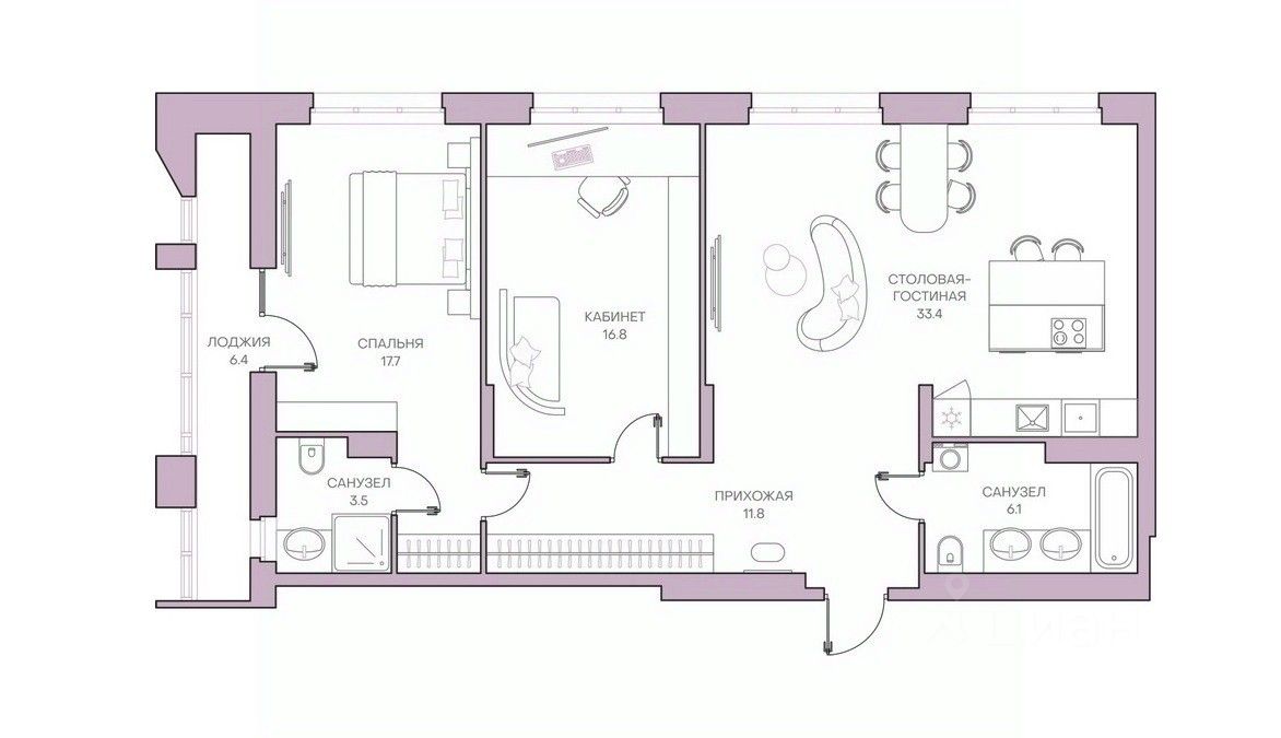 • Планировка: мастер-блок со своим санузлом 17,7 м²; детская 16,8 м²; гостиная 17,1 м², зона кухни 16,2 м².