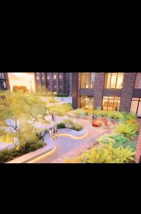 - Благоустройство с всесезонным озеленением и зонами с биокамином для тихого отдыха