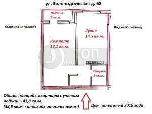 - Общая площадь квартиры 38,8 кв.м. (+ лоджия 3 кв.м. с панорамным остеклением и отличным видом на закаты);