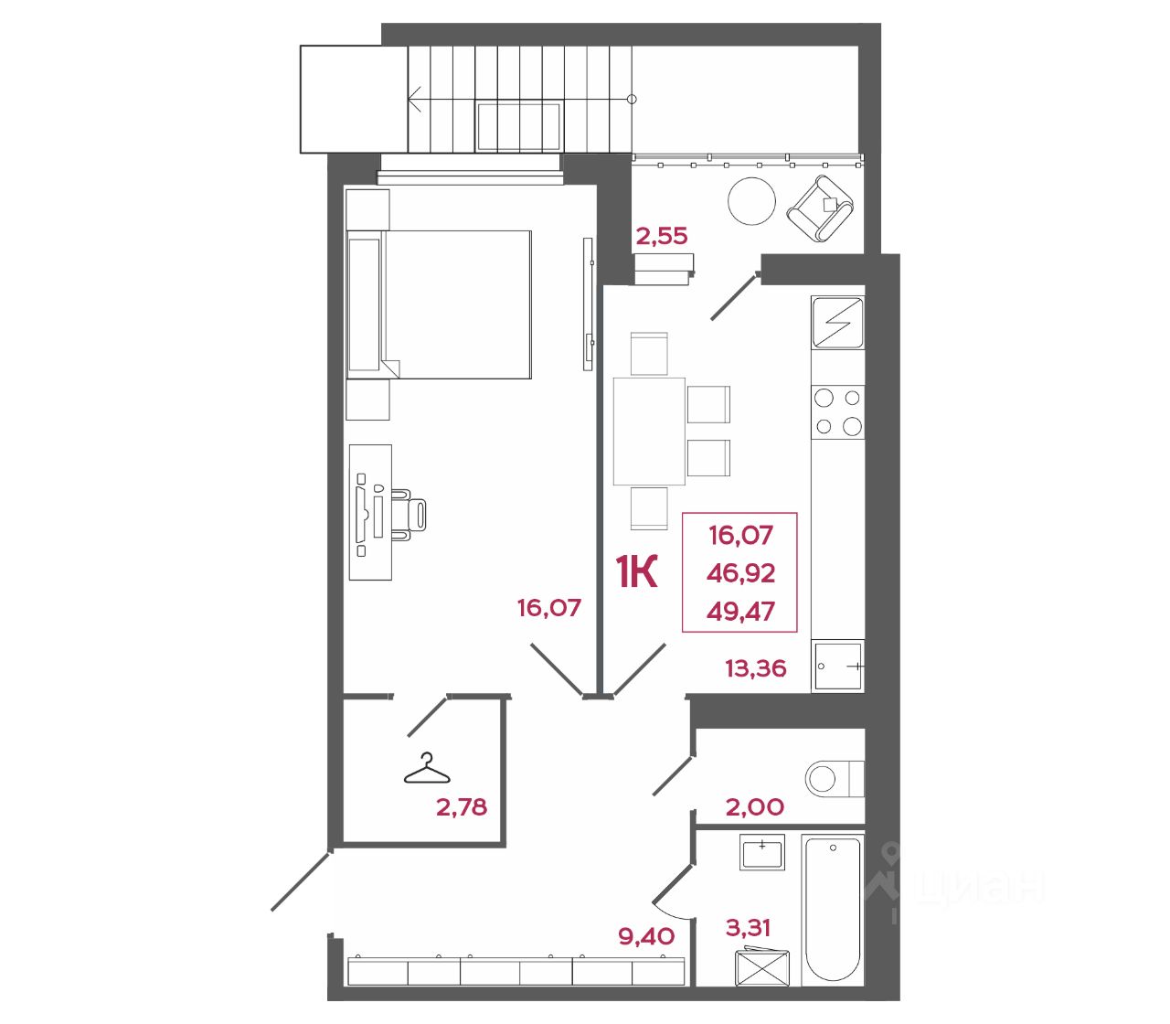 Общая площадь49,47 м²