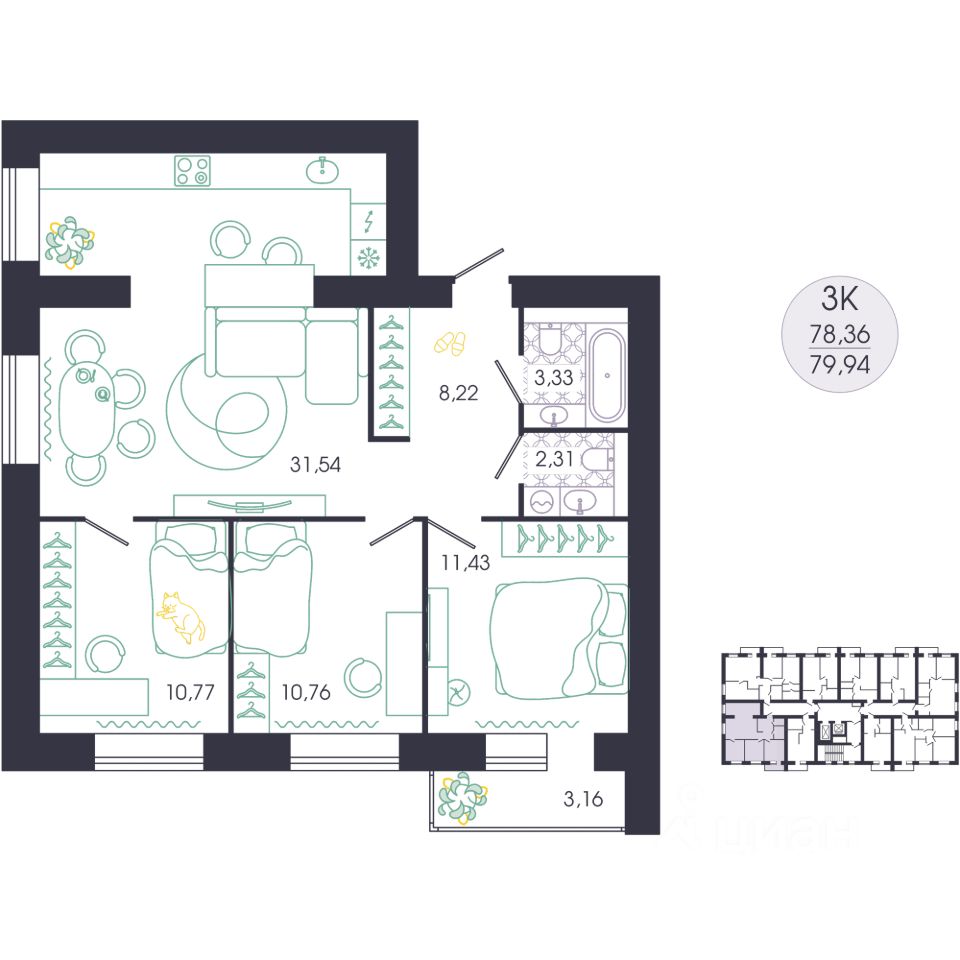 Продаётся 3-комнатная квартира в строящемся доме (Корпус 1), срок сдачи: IV-кв. 2027, общей площадью 79.94 кв.м., на 5 этаже. Новый жилой комплекс "Доброе" от застройщика "ГК Автор" расположен по адресу Россия, Пенза, Колышлейская улица, 7.