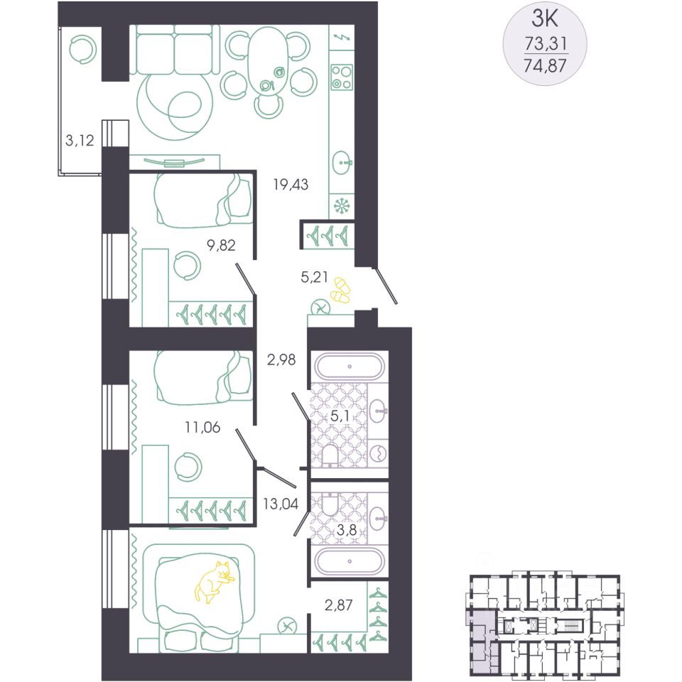 Продаётся 3-комнатная квартира в строящемся доме (Корпус 1), срок сдачи: IV-кв. 2027, общей площадью 74.87 кв.м., на 8 этаже. Новый жилой комплекс "Доброе" от застройщика "ГК Автор" расположен по адресу Россия, Пенза, Колышлейская улица, 7.