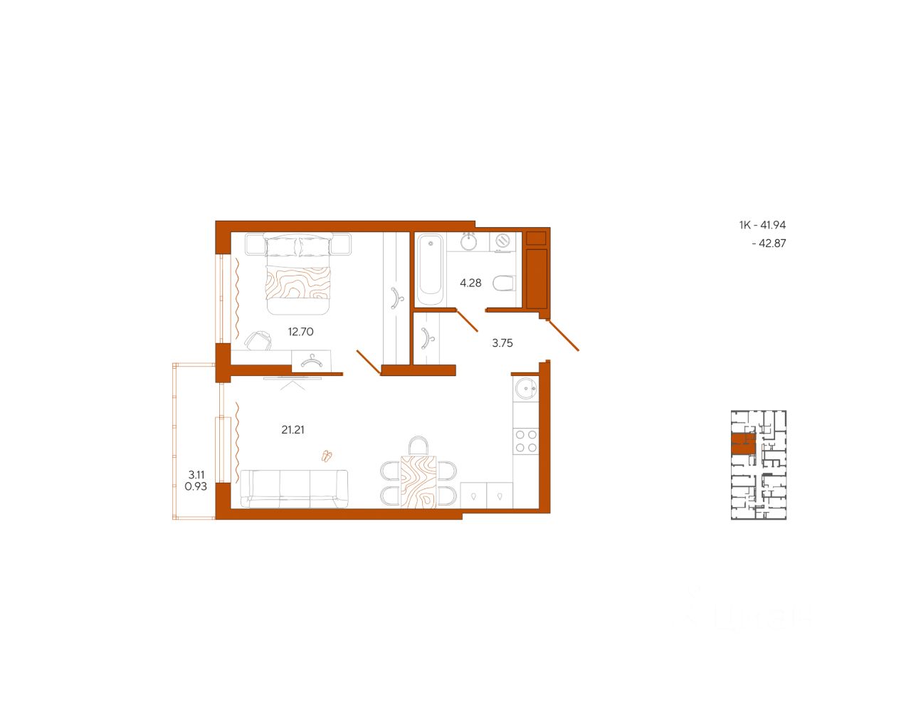 Общая площадь42,87 м²