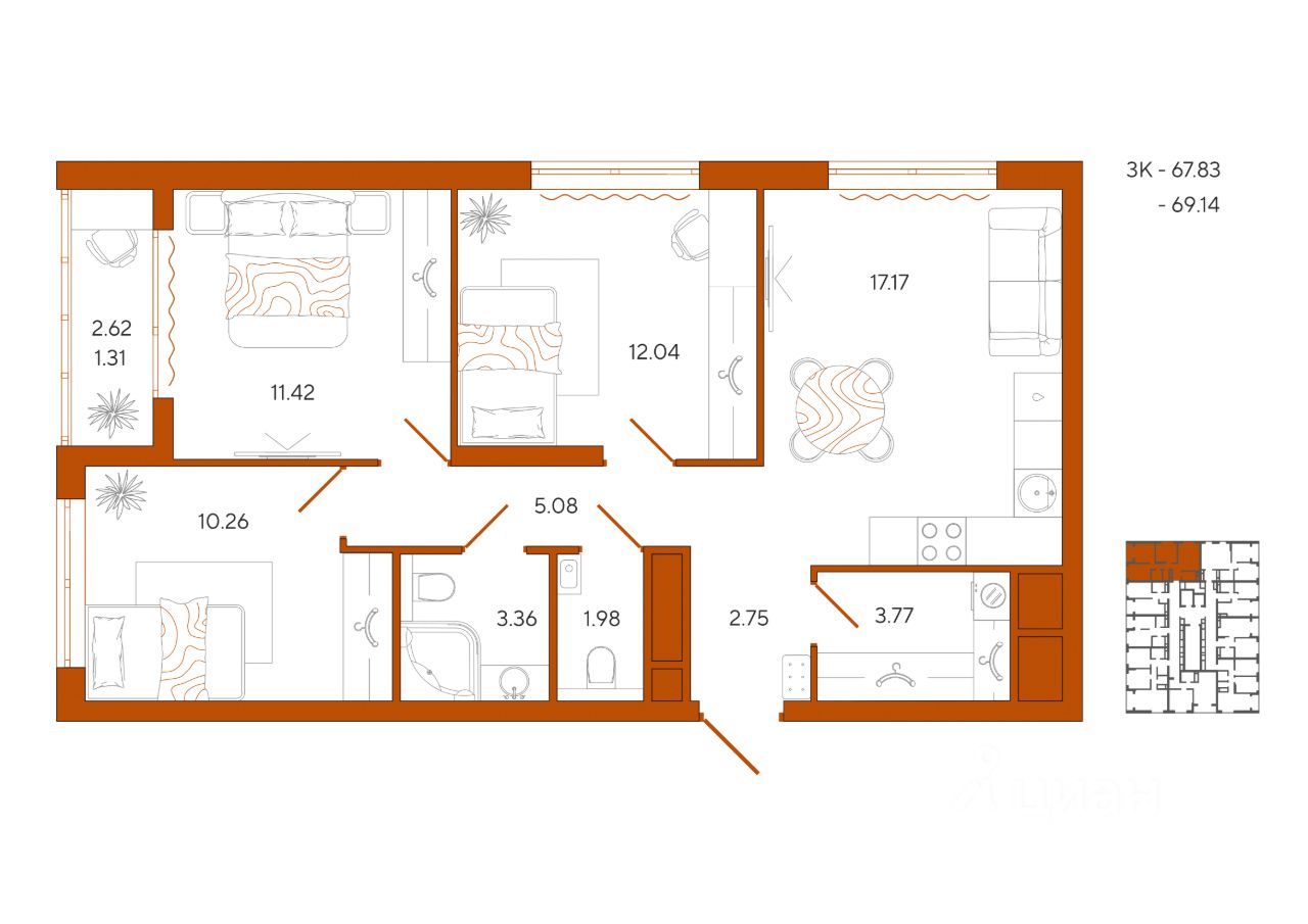Продаётся 3-комнатная квартира в строящемся доме (Корпус 1), срок сдачи: I-кв. 2029, общей площадью 69.14 кв.м., на 13 этаже. Новый жилой комплекс "Терра" от застройщика "АВТОР НОВОЙ ЖИЗНИ" расположен по адресу Пензенская область, Город Пенза, Улица Кижеватова.
