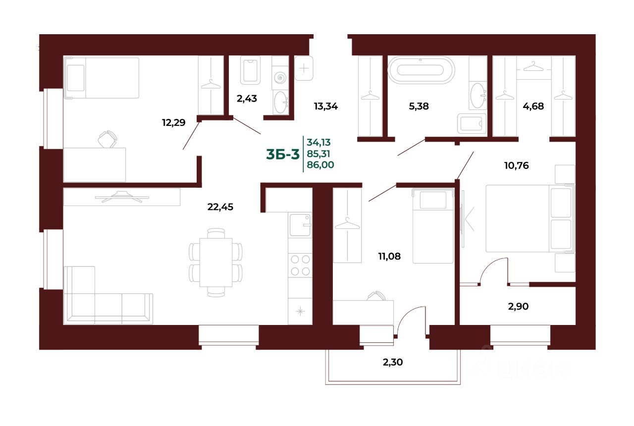 Продаётся 3-комнатная квартира в строящемся доме (2 этап), срок сдачи: IV-кв. 2027, общей площадью 85.72 кв.м., на 10 этаже. Новый жилой комплекс "АРБЕРИ" от застройщика "ГК Автор" расположен по адресу Пенза, проспект Строителей.