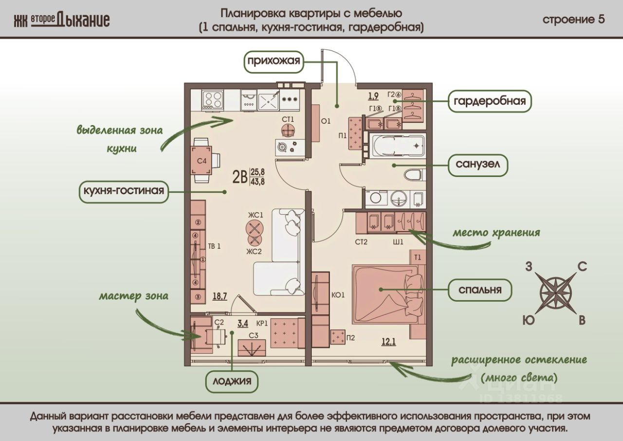 В данной планировке есть четкое деление на зоны, к тому же сохранено общее большое пространство. Гардеробная комната при входе позволяет решить вопрос компактного размещения вещей. Она обеспечивает сохранность предметов одежды и обувь, когда они долгое время не востребованы, и позволяет содержать в идеальном порядке вещи, которые используются ежедневно. Главное достоинство данной квартиры, просторная кухня-гостиная 18.7 кв.м. вокруг которой строится вся планировка. Здесь можно собираться с семьёй и друзьями, готовить вместе еду, смотреть фильмы, проводить большую часть своего активного времени. Отдельно выделенное пространство для приготовления пищи оценит любая хозяйка. Большим плюсом также является выход на тёплую лоджию. При желании можно организовать комнату отдыха, оборудовать рабочий кабинет и т.д. Всё зависит от предпочтений и личного вкуса владельцев квартиры.