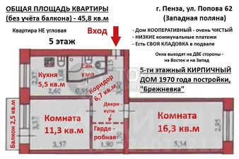 КВАРТИРА на ПОСЛЕДНЕМ 5-ом этаже с КРАСИВЫМ ВИДОМ из окон! Сверху НЕТ СОСЕДЕЙ, а значит шуметь некому! НЕ угловая, очень ТЁПЛАЯ! Окна выходят на 2 стороны, на Запад и на Восток!