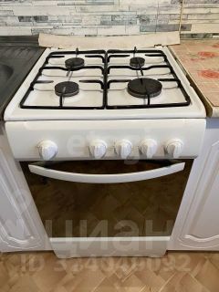 Просторная кухня с большим окном оборудована компактным, но вместительным кухонным гарнитуром и полноценной газовой плитой с духовым шкафом. В кухне есть небольшой обеденный стол с табуретами.