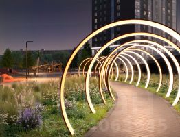 Закрытый двор без машин с уникальным космическим дизайном: сухой фонтан "Планета", амфитеатр, детские площадки, канатный комплекс, зоны для спорта и настольных игр. Озеленение хвойными и лиственными деревьями.