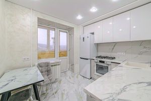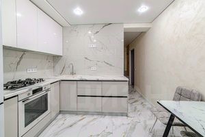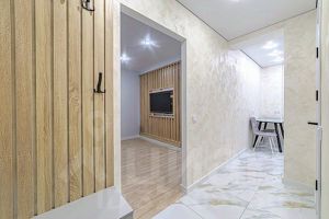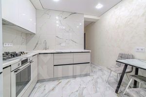 При ремонте квартиры использовались самые современные отделочные материалы: металлическая входная дверь, зона прихожей и кухня плитка, комната-ламинат, с/у керамическая плитка; стены выровнены по маякам и покрашены; коридор и кухня-декоративная штукатурка, натяжные потолки.