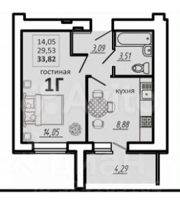 Площадь квартиры 33.82/14.05/8.88 кв.м.