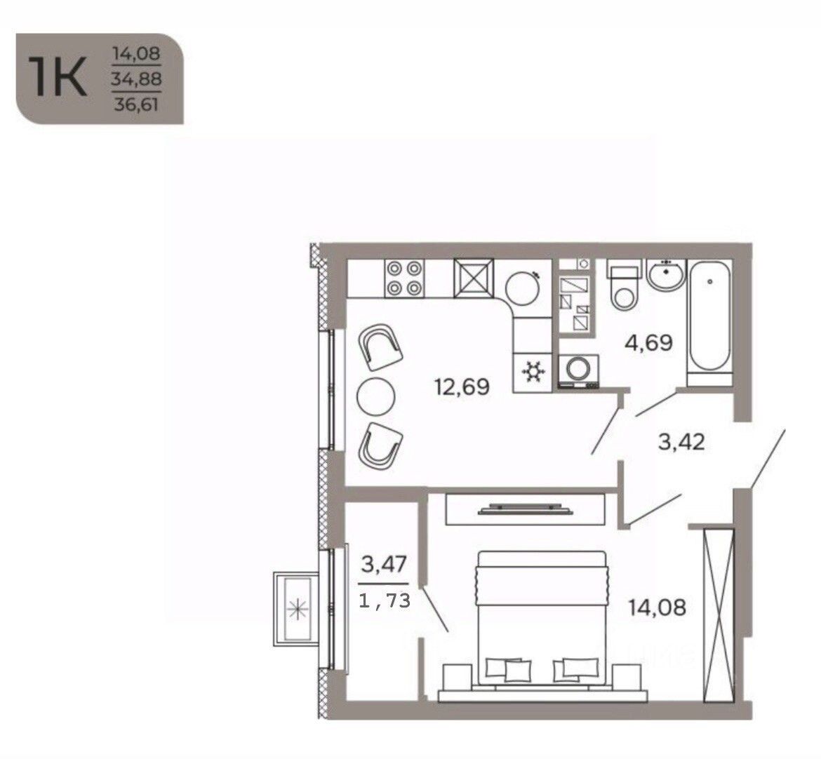 Общая площадь36,61 м²