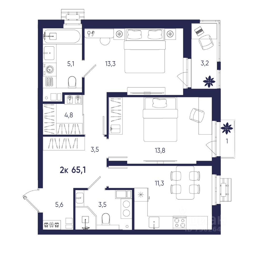 Общая площадь65,1 м²