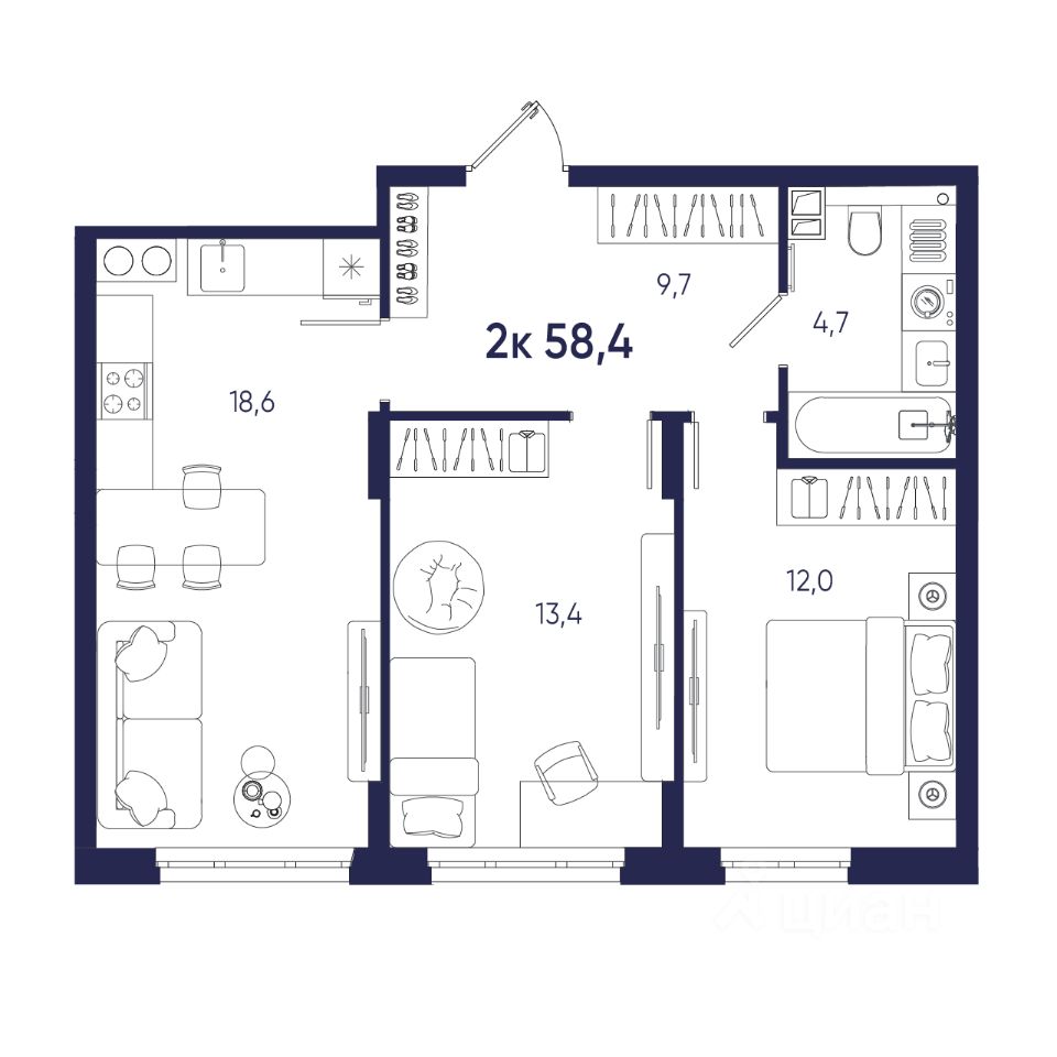 Общая площадь58,4 м²
