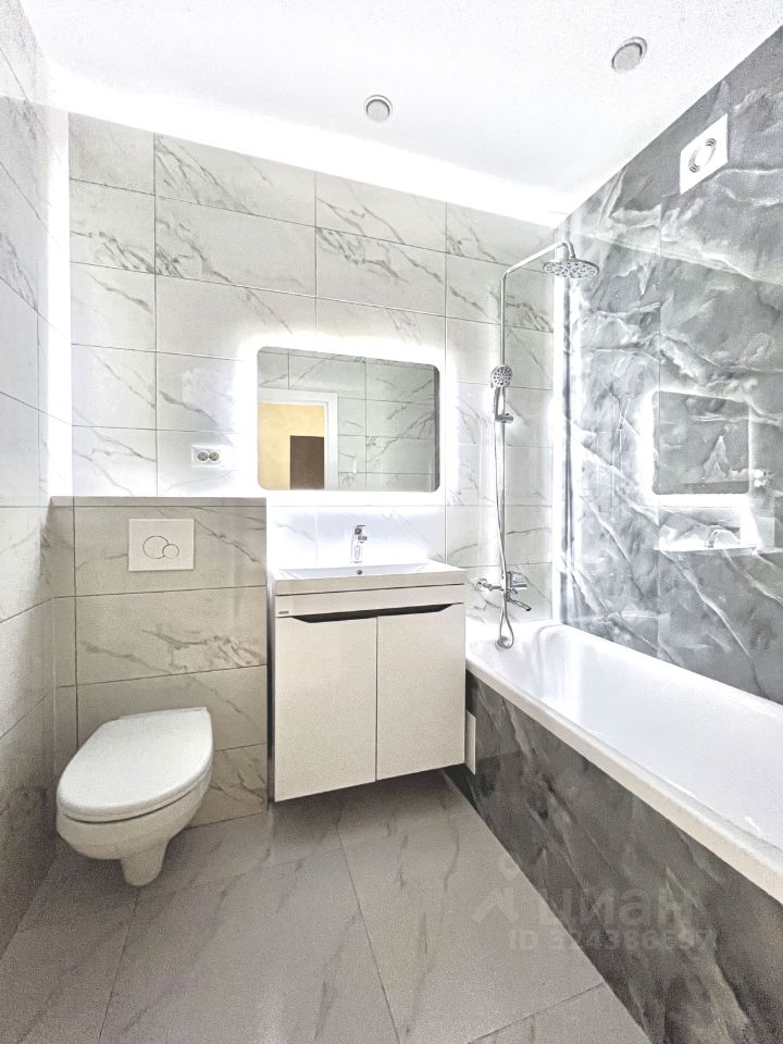 Санузел в современной кафельной плитке, инсталяция, зеркало с подсветкой, акриловая ванна, хорошие смесители.