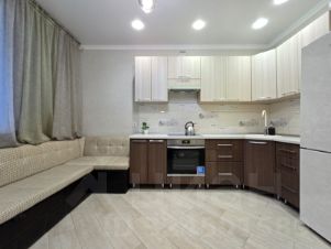Состояние квартиры отличное. Напольное покрытие: в прихожей и на кухне керамогранит, в остальных комнатах ламинат. Потолки: натяжные. Стены: обои.