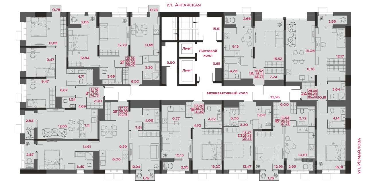 - коллекция квартир от 24,48 до 129,82 м²