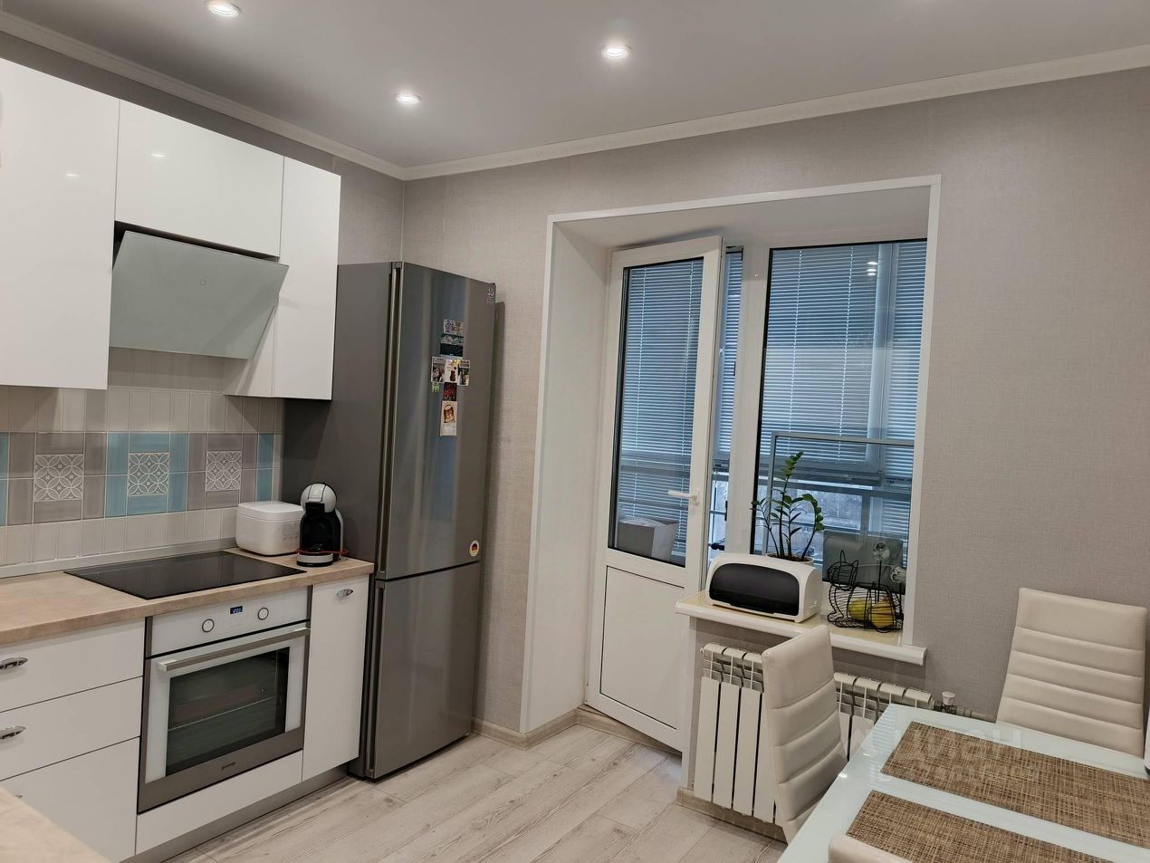 Лоджия остеклена, на полу в зоне коридора керамогранит, в комнате и на кухне - ламинат, везде натяжные потолки.