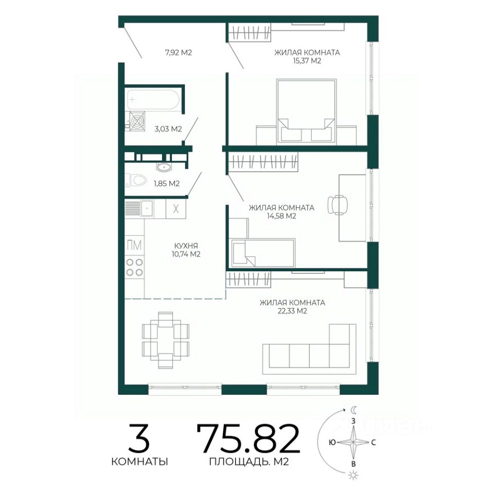 Продаётся 3-комнатная квартира в строящемся доме (2 этап (1 строение)), срок сдачи: III-кв. 2027, общей площадью 75.82 кв.м., на 17 этаже. Новый жилой комплекс "Чаадаев" от застройщика "Территория Жизни" расположен по адресу Россия, Пенза, улица Чаадаева, 60Б/2.