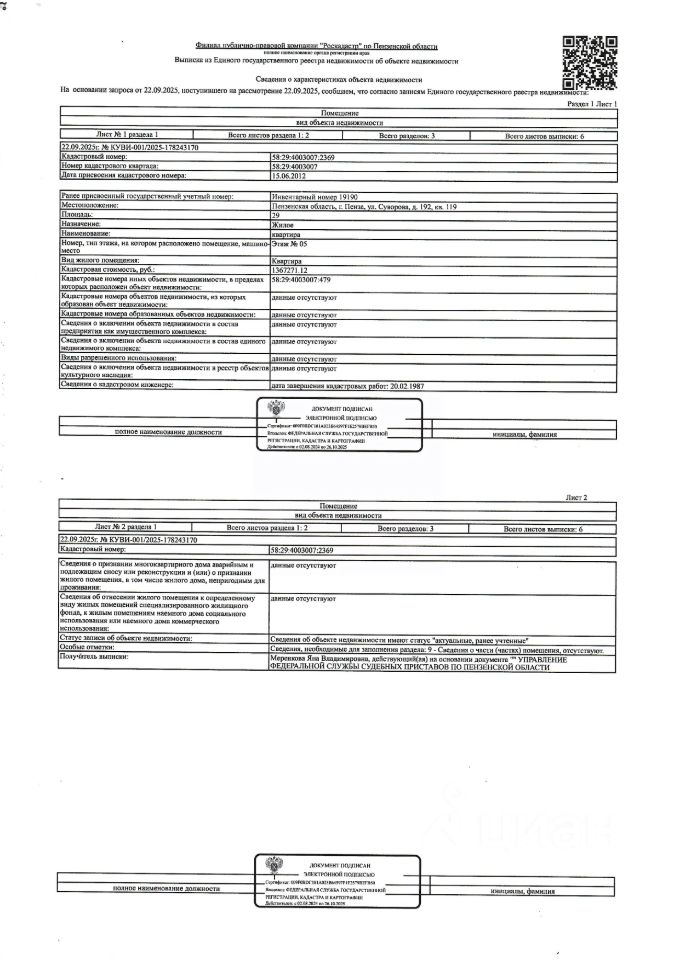 Жилое помещение (квартира) общей площадью 29 кв.м., кад. 58:29:4003007:2369, этаж 5, расположенное в пределах объекта недвижимости с кад. 58:29:4003007:479, принадлежащее должнику Глухову Д.М. По месту нахождения объекта зарегистрированные лица отсутствуют. Сведениями о задолженности по коммунальным платежам и взносам на капитальный ремонт, а также о фактическом состоянии объекта недвижимости организатор торгов не располагает. Техническая документация и фотографии объекта отсутствуют у организатора торгов.
