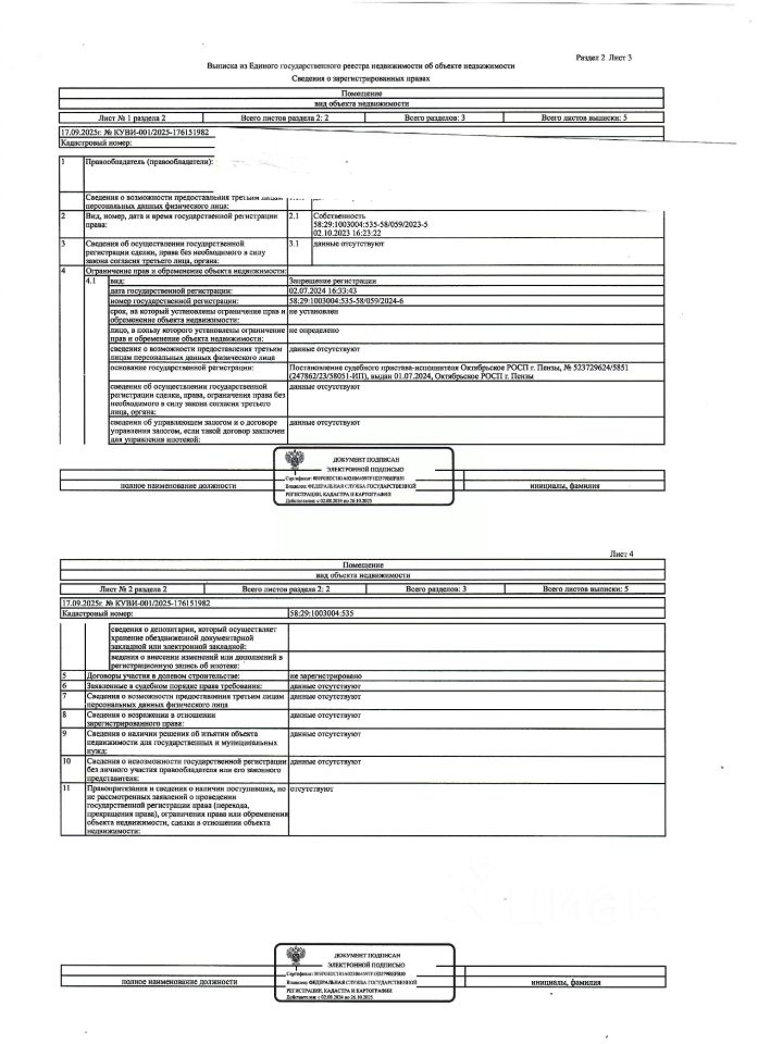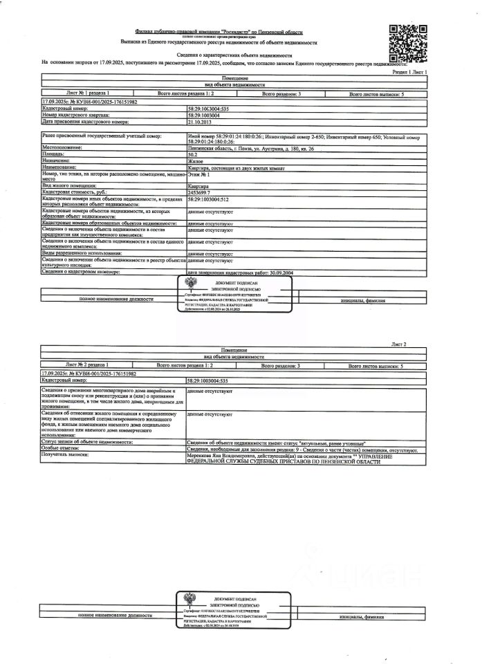 Жилое помещение (квартира) общей площадью 50,2 кв.м., , кад. 58:29:1003004:535, этаж 1, расположенное в пределах объекта недвижимости с кад. 58:29:1003004:512, принадлежащее должнику Смирнову Д.И. По месту нахождения объекта зарегистрированные лица отсутствуют. Сведениями о задолженности по коммунальным платежам и взносам на капитальный ремонт, а также о фактическом состоянии объекта недвижимости организатор торгов не располагает. Техническая документация и фотографии объекта отсутствуют у организатора торгов.