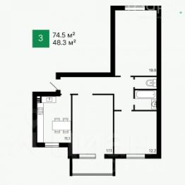 Жилaя площадь: 48,3 м² (комнаты 19,0 м², 17,1 м² и 12,2 м²)