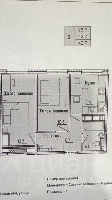 Площадь: общая 42,6 м² / жилая 23,9 м².