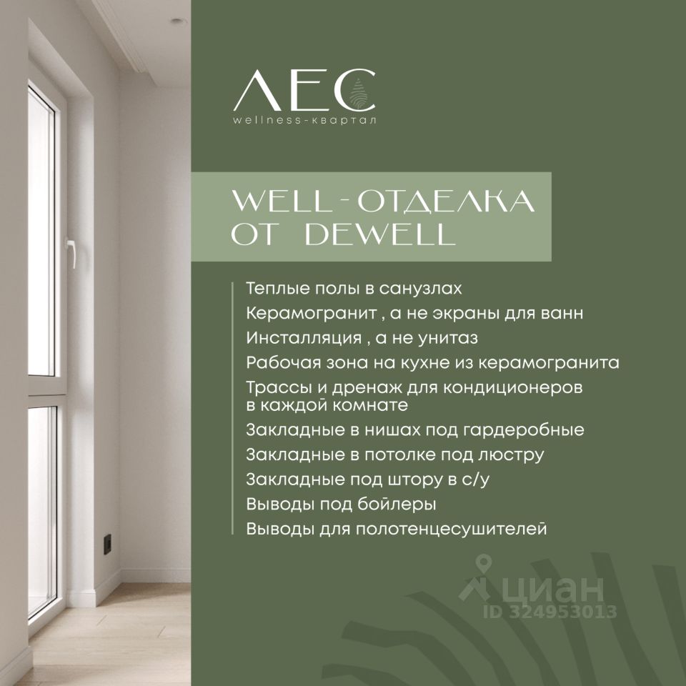 Квартиры с отделкой "ПОД КЛЮЧ" Малоквартирные 5-этажные дома повышенного комфорта. Все квартиры сдаются с полноценной WELL-отделкой. Вкаждой секции лифт, который спускается в подземный паркинг. Отделка "под ключ" — ваше время и бюджет сэкономлены: Комфорт: Тёплые полы в санузлах и инсталлиция вместо унитаза Подключите технику легко: Выводы и розетки для посудомоечной и стиральной машины, дренаж для кондиционера, internet-розетка Стиль без доплат: Дизайнерские черные розетки, светлые тона ламината 33 класса, керамогранит и закладные под гардеробные и люстры. Почему это выгодно? -Отделка уже в ипотеке! Никаких доплат, шума и пыли после новоселья. Больше не нужно: Искать строителей Выбирать материалы Волноваться о проводке Можно сразу: Заселяться Расставлять мебель Наслаждаться жизнью Ваш новый образ жизни в wellness-квартале: Собственный лесной парк с зонами для йоги и пикников. Безопасный двор без машин, где гуляют дети и катаются на велосипедах. Вся инфраструктура (школы, сады, спорт, кафе) — в комфортной доступности.