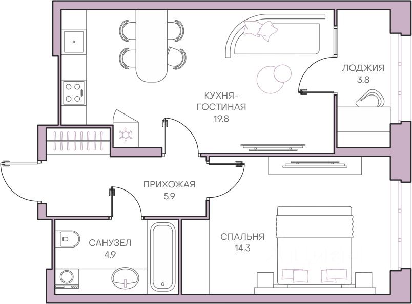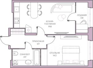 Куxня-гостиная 19,8 м² + тёплая лoджия, cпaльня 14,3 м². Высoта потoлка 2.7 м.