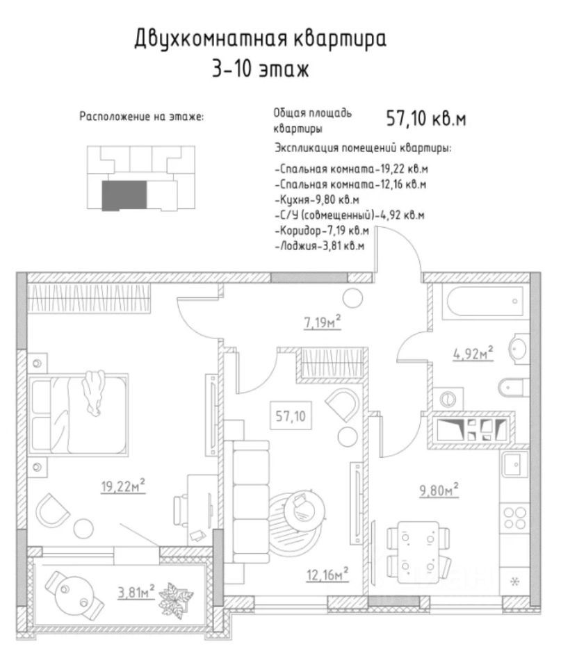 Лоджия застеклена (панорамное остекление) - 3.81 кв. м.;