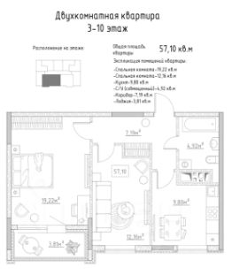 Площадь комнат - 19.22 кв. м.+ 12.16 кв. м.