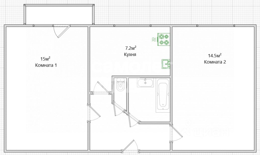 В квартире установлены натяжные потолки, застекленный балкон с выходом из комнаты. Отсутствует мебель.