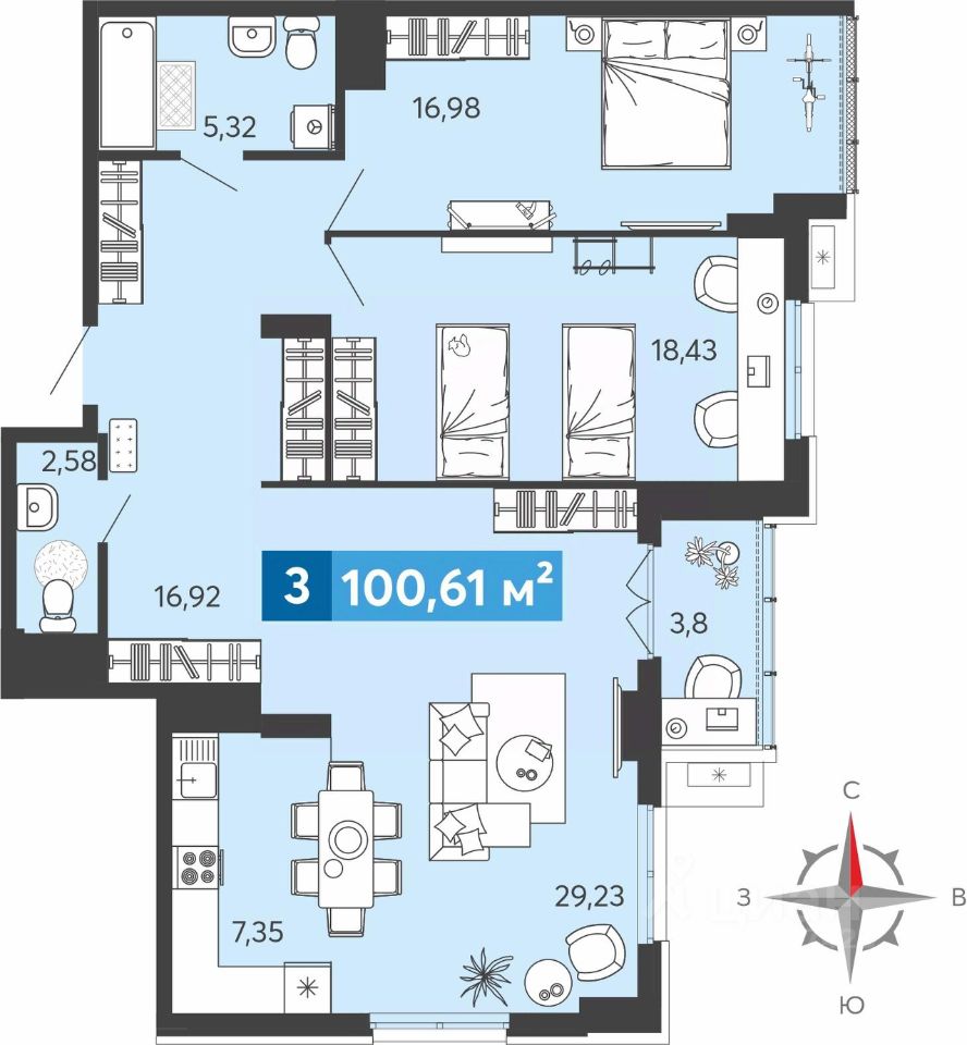 Продаётся 3-комнатная квартира в строящемся доме (3 этап (Астерион)), срок сдачи: IV-кв. 2026, общей площадью 101 кв.м., на 3 этаже. ЖК "Созвездие" - это жилой комплекс комфорт-класса из шести домов (17, 25 и 30 этажей), расположенный на берегу озера и отвечающий последним технологическим стандартам.Двор ЖК "Созвездие" спроектирован закрытым, здесь будут космические цветы и беседки в виде звездных систем, необычные детские площадки и широкие дорожки в окружении зелени, зоны спорта и солярия.На территорию ЖК можно будет попасть через единую входную группу, где на первом этаже появятся пункт охраны, колясочные, установят почтовые ящики, обустроят комфортную зону для встречи гостей. На втором - соседский центр площадью 500 кв. м с детской и лаундж-зоной, игровым пространством и даже уютным кухонным уголком.