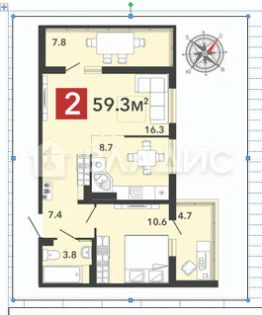 Общая площадь 59,3 кв. м, из которых 26,9 кв. м — жилая площадь.