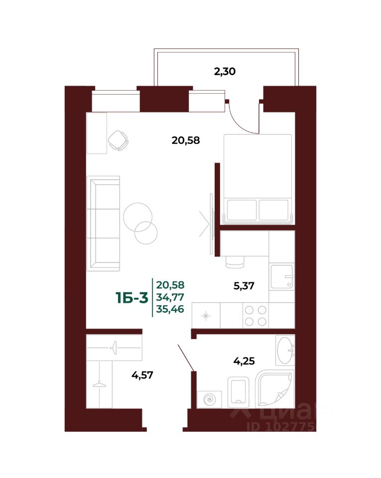 Общая площадь35,44 м²