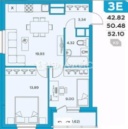 Общая площадь квартиры составляет 52,1 кв. м, из которых 22,89 кв. м — жилая площадь, 3,26 кв. м - панорамная лоджия, а просторная кухня площадью 19,93 кв. м станет любимым местом для семейных ужинов и дружеских посиделок.