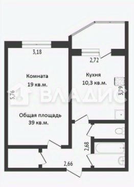 Общая площадь квартиры составляет 39,1 кв. м, из которых 18,3 кв. м — жилая площадь, а 10,5 кв. м — кухня.