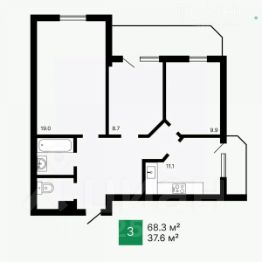 Общая площадь: 68,3 кв.м. + 2 лоджии 11,9 кв.м
