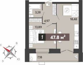1-комн. квартира с предчистовой отделкой в ЖК "8 Марта" на 7 этаже. Общая площадь: 47.8 кв.м., жилая: 13.89 кв.м., площадь просторной кухни-столовой: 18.48 кв.м. Все окна выходят на одну сторону. В квартире один балкон, один совмещенный санузел. Высота потолков 2.7 м.